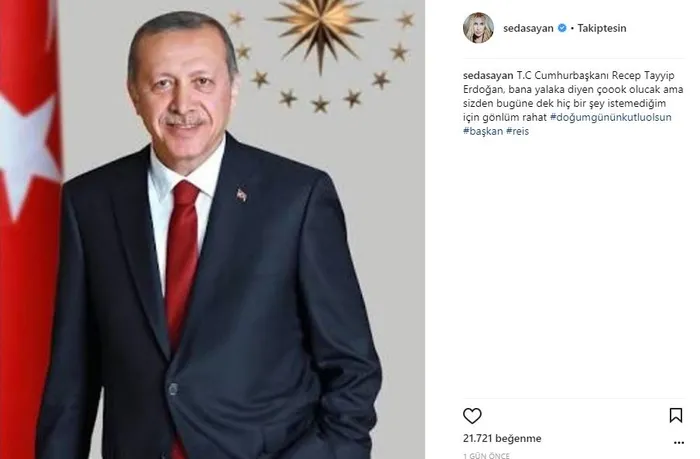 Seda Sayan: "T.C. Cumhurbaşkanı Recep Tayyip Erdoğan, bana yalaka diyen çok olacak ama sizden bugüne dek hiçbir şey istemediğim için gönlüm rahat. Doğum günün kutlu olsun Reis."