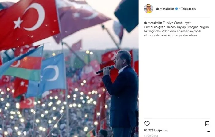 Demet Akalın: "Türkiye Cumhurbaşkanı Recep Tayyip Erdoğan bugün 64 yaşında... Allah onu başımızdan eksik etmesin, daha nice güzel yaşları olsun...",