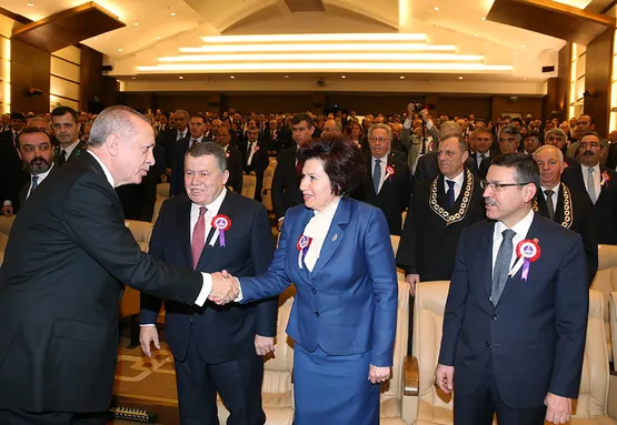 Türkiye'nin medeniyetinde ve kültüründe mevcut bulunan kadim adalet mirası sayesinde demokrasi ve hukuk devleti yolundaki atılımlarını güçlü bir şekilde hayata geçirme imkanına sahip olduğunu kaydeden Erdoğan, "Asırlardır yaşadığımız tüm olumsuzluklara rağmen her defasında süratle toparlanıp, yeniden demokrasi ve hukuk devleti yoluna girebiliyorsak işte bu sayededir. Son yıllarda bu durumun yeni ve tarihi örneklerini hep birlikte yaşadık. Demokrasiye ve hukuk devletine olan bağlılığımızdan taviz vermeden, vesayetten tutun, darbe teşebbüslerine ve terör saldırılarına kadar nice tehdidin üstesinden gelmeyi başardık. Hatta sadece tehditleri bertaraf etmekle kalmadık. Çok kritik bir yönetim değişikliği sürecini suhuletle neticeye ulaştırdık. Şimdi 24 Haziran'da yapılacak seçimlerin ardından tüm unsurları ile hayata geçecek olan yeni yönetim sistemimiz ile yürütmeyi daha güçlü, yasamayı daha itibarlı, yargıyı da daha bağımsız hale getirmeyi hedefliyoruz" dedi.