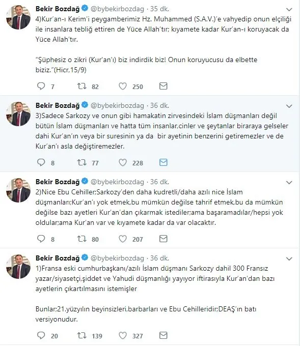 Fransa eski cumhurbaşkanı, azılı İslam düşmanı Sarkozy dahil 300 Fransız yazar, siyasetçi, 'şiddet ve Yahudi düşmanlığı yayıyor' iftirasıyla Kur'an'dan bazı ayetlerin çıkartılmasını istemişler. Bunlar; 21. yüzyılın beyinsizleri, barbarları ve Ebu Cehilleridir. DEAŞ'ın batı versiyonudur. Nice Ebu Cehiller, Sarkozy'den daha kudretli, daha azılı nice İslam düşmanları, Kur'an'ı yok etmek, bu mümkün değilse tahrif etmek, bu da mümkün değilse bazı ayetleri Kur'an'dan çıkarmak istediler ama başaramadılar, hepsi yok oldular ama Kur'an var ve kıyamete kadar da var olacaktır. Sadece Sarkozy ve onun gibi hamakatin zirvesindeki İslam düşmanları değil bütün İslam düşmanları ve hatta tüm insanlar, cinler ve şeytanlar bir araya gelseler dahi Kur'an'ın veya bir suresinin ya da bir ayetinin benzerini getiremezler ve de Kur'an'ı asla değiştiremezler.