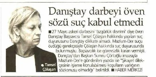 10 Mart 2008 tarihli Cumhuriyet gazetesinde yayınlanan habere göre Tansel Çölaşan'ın her cümlesi nefret suçu içeren açıklamaları şöyle devam ediyor: "Demokrat Parti başa gelmesiyle ne olduysa oldu. Din adamları kaşındı. O dönemde tek kurtarıcı olarak ordu göründü. Toplum tarafından görev verildi ve 27 Mayıs oldu. Toplumsal dönüşüm oldu.