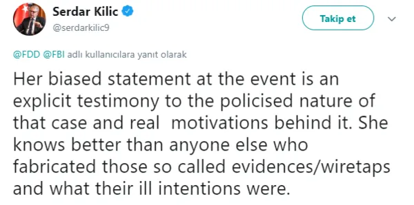Türkiye'nin Washington Büyükelçisi Serdar Kılıç, skandal ödül töreniyle ilgili olarak Twitter hesabından yaptığı paylaşımda, dava ile FETÖ arasındaki bağa dikkati çekti.