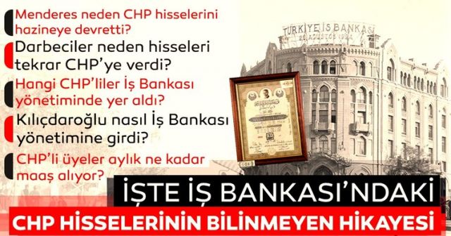 1950 sonrası Adnan Menderes, 'CHP'nin Haksız İktisaplarının İadesi Kanunu'nu' çıkardı. Böylece İş Bankası'ndaki Atatürk hisseleri de Hazine'ye devredilmiş oldu.. İsmet İnönü o vakit Menderes'e, 'Atatürk'ün vasiyetini çiğniyorsunuz' diyerek muhalefet etmişti.. 27 Mayıs darbecileri, bu kanunu iptal ederek yeniden hisseleri CHP'ye verdi. 12 Eylül darbesinde CHP kapatıldığı için hisselerin temsili Cumhurbaşkanlığı Genel Sekreterliği'ne geçti.. Parti açılınca yeniden parti o hisseleri aldı.. Bugünkü durumda ise artık herşey ortada.. Bir partinin banka patronu olamayacağı çok açık. E hiç bir maddi menfaati de olmadığını beyan ettiğine göre CHP, bizzat kendisi önayak olmalı ve hisselerin Hazine'ye yani devletine/devletimize devrini kendi gerçekleştirmeli.. Bu kadar ısrar kıyamet karşı çıkmalarının ne nedeni olabilir, insan merak ediyor..