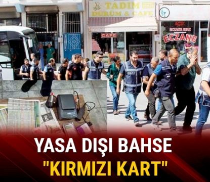 Emniyet Genel Müdürlüğü Asayiş Dairesi Başkanlığı koordinesinde yasa dışı bahis oynatılmasının engellenmesi amacıyla yurt genelinde ‘Kırmızı Kart’ operasyonu düzenledi. Türkiye genelinde önceki gün 2 bin 105 ekip, 6 bin 589 personelin katılımıyla 81 il merkezi ve dış ilçelerde gerçekleştirilen uygulamada 5 bin 867 işyeri kontrol edildi.
