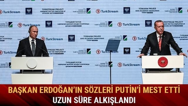 TürkAkım Projesi Deniz Bölümünün Tamamlanması dolayısıyla tören düzenleniyor. Başkan Erdoğan, 'Biz Rusya ile ilişkilerimizi diğer ülkelerin dayatmalarına göre belirlemedik. Hem bölgemizde hem de küresel alanda barışın ve istikrarın temini için Rus dostlarımızla çaba harcadık. Özellikle Suriye'de önemli katkılarını gördük. Akkuyu Nükleer Santral projesini de Rusya ile hayata geçiriyoruz.' dedi. Başkan Erdoğan'ın bu sözleri Rus Lideri Putin ile salondakiler tarafından uzun süre alkışlandı.