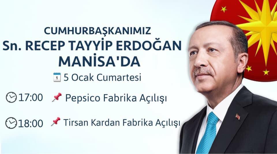 Cumhurbaşkanı Recep Tayyip Erdoğan’nın bir dizi ziyaret ve açılışlarda bulunmak üzere 5 Ocak 2019 Cumartesi günü Manisa’ya geleceği öğrenildi.