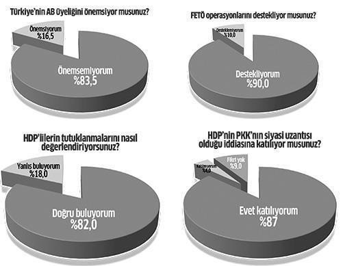 Yine katılımcılara "Kamuoyunda HDP'nin PKK terör örgütünün siyasi uzantısı olduğu ifade edilmektedir. Siz bu ifadeye katılıyor musunuz" sorusu yöneltildi. Halkın yüzde 87'si 'evet katılıyorum' derken, 'hayır' diyenlerin oranı yüzde 4, fikir belirtmeyen ise yüzde 9 oranını oluşturdu. Son günlerde FETÖ, Cumhuriyet gazetesi ve HDP'lilerin tutuklanmasıyla ilgili gerilen AB ile ilişkiler de vatandaşa soruldu.