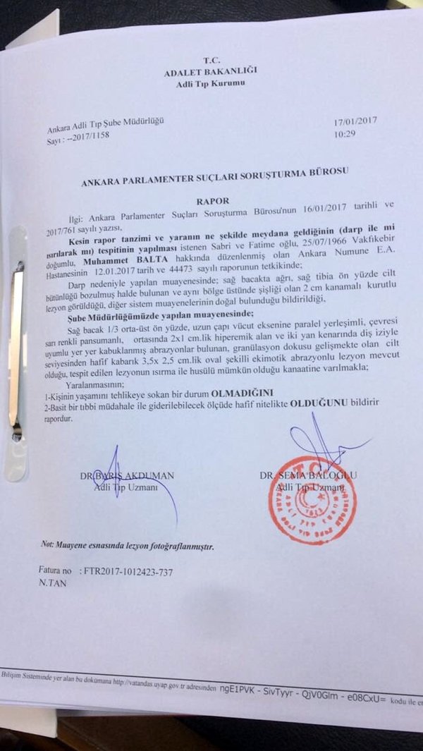 AK Parti Trabzon Milletvekili Muhammet Balta'nın TBMM Genel Kurulundaki kavgada bacağından ısırıldığı kesinleşti. Balta, ısırıldığına dair aldığı Adli Tıp Kurumu'ndan raporu sosyal paylaşım sitesi Twitter'daki hesabından paylaştı.