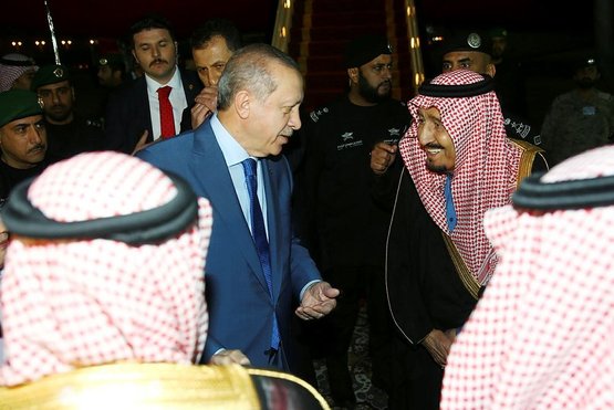 Cumhurbaşkanı Erdoğan'ın Körfez ülkeleri ziyaretinin ikinci durağı, Suudi Arabistan oldu. Erdoğan'ı, Riyad Kral Selman Hava Üssü'nde, Suudi Arabistan Kralı Selman bin Abdülaziz, Dışişleri Bakanı Adil el-Cubeyr, Riyad Emiri Faysal bin Bender bin Abdülaziz, Türkiye'nin Riyad Büyükelçisi Yunus Demirer ile büyükelçilik yetkilileri karşıladı. Erdoğan daha sonra Suudi Arabistan Veliaht Prensi Muhammed bin Nayif'i kabul etti. Kraliyet Misafirhanesi'nde yaklaşık 25 dakika süren görüşme, basına kapalı olarak gerçekleşti. Erdoğan'a, eşi Emine Erdoğan, Genelkurmay Başkanı Orgeneral Hulusi Akar, Dışişleri Bakanı Mevlüt Çavuşoğlu, Enerji ve Tabii Kaynaklar Bakanı Berat Albayrak, Ekonomi Bakanı Nihat Zeybekci, Milli Savunma Bakanı Fikri Işık ile MİT Müsteşarı Hakan Fidan eşlik ediyor.