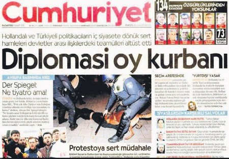 Türkiye düşmanlığını kendisine iş edinen Cumhuriyet gazetesi dünkü manşetinde Türkiye Cumhuriyeti'ni hedef alarak yine tarafını belli etti. Gazete "Diplomasi oy kurbanı" manşeti atarak Türkiye'yi suçladı. Gazete, Aile ve Sosyal Politikalar Bakanı Kaya'nın sınır dışı edilmesine varan olayları "oy toplamak" kisvesi altında okuyucularına duyurdu.