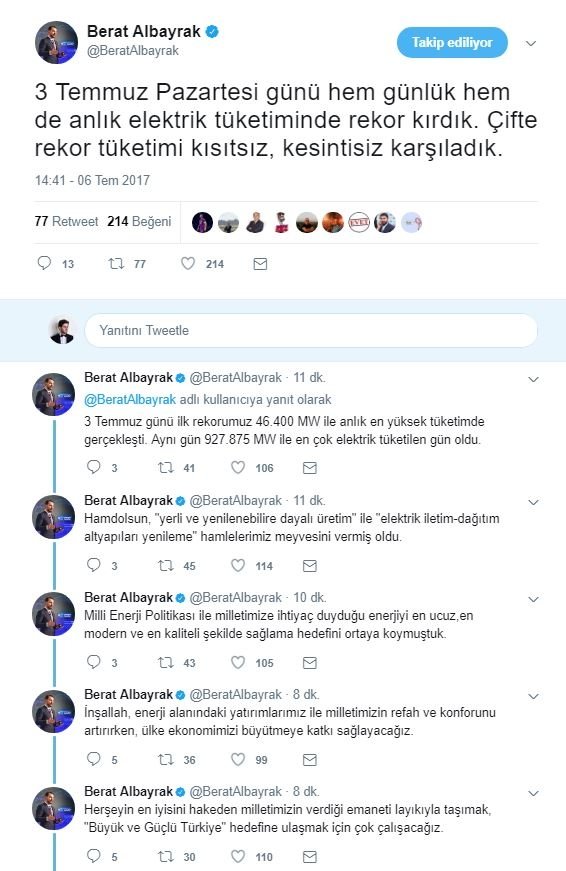 Berat Albayrak Twitter üzerinden yaptığı açıklamada şunları söyledi;