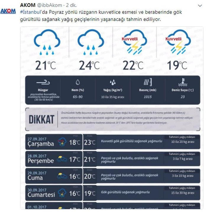 İstanbul Büyükşehir Belediyesi Afet Koordinasyon Merkezi (AKOM) da Twitter hesabından İstanbulluları uyardı. AKOM, ''İstanbul'da Poyraz yönlü rüzgarın kuvvetlice esmesi ve beraberinde gök gürültülü sağanak yağış geçişlerinin yaşanacağı tahmin ediliyor'' uyarısında bulundu.