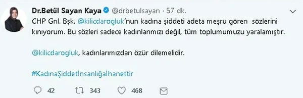 Tepkisini sosyal medya hesabı Twitter'dan dile getiren Bakan Kaya, "Kılıçdaroğlu'nun kadına şiddeti adeta meşru gören sözlerini kınıyorum. Bu sözleri sadece kadınlarımızı değil, tüm toplumumuzu yaralamıştır. Kılıçdaroğlu kadınlarımızdan özür dilemelidir" dedi.