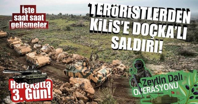 11.20: Türk Silahlı Kuvvetlerince (TSK) başlatılan Zeytin Dalı Harekatı kapsamında Suriye'deki terör hedeflerine yönelik operasyonların sürdüğü bölgeye Kilis'ten top atışları yapılıyor. Özgür Suriye Ordusu'nun da katıldığı harekatın üçüncü gününde Afrin'deki hedeflere ilerleyen birliklere top atışlarıyla destek veriliyor. Sınırda konuşlu TSK'ya bağlı birliklerce terör örgütü PYD/PKK'nın işgal ettiği alanlara yönelik zaman zaman yoğunlaşan atışlar, Kilis kent merkezinin yanı sıra Hatay hudut hattındaki bazı köylerden de duyuluyor. Bu arada, sınırdaki birliklere de ara ara askeri araç takviyesi yapılıyor.