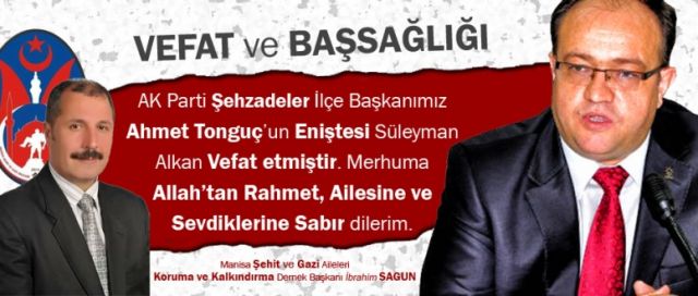 AK Parti Şehzadeler İlçe Başkanımız Ahmet Tonguç’un eniştesi Süleyman Alkan vefat etmiştir. ...