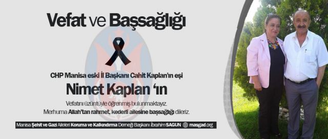 CHP Manisa eski İl Başkanı Cahit Kaplan'ın eşi Nimet Kaplan vefat etti.