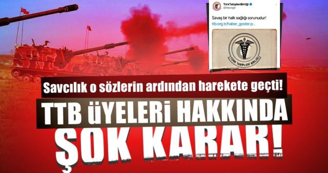 TSK tarafından hudutlarda ve bölgede güvenlik ve istikrarı sağlamak amacıyla Suriye'nin kuzeybatısındaki Afrin bölgesinde PKK/KCK/PYD-YPG ve DEAŞ'a mensup teröristlere yönelik başlatılan harekata ilişkin "Savaş bir halk sağlığı sorunudur" diyen TTB hakkında İçişleri Bakanlığınca dün suç duyurusunda bulunulmuştu. Ayrıca Sağlık-Sen de savcılığa başvurarak şikayet dilekçesi vermişti. Suç duyurusu dilekçelerini işleme koyan Ankara Cumhuriyet Başsavcılığı, TTB Merkez Konseyi üyesi 11 kişi hakkında "Türk Milletini, Türkiye Cumhuriyeti Devletini, Türkiye Büyük Millet Meclisini, Türkiye Cumhuriyeti Hükümetini ve devletin yargı organlarını alenen aşağılama" ve "Halkın sosyal sınıf, ırk, din, mezhep veya bölge bakımından farklı özelliklere sahip bir kesimini, diğer bir kesimi aleyhine kin ve düşmanlığa alenen tahrik" suçlamalarından soruşturma başlattı.