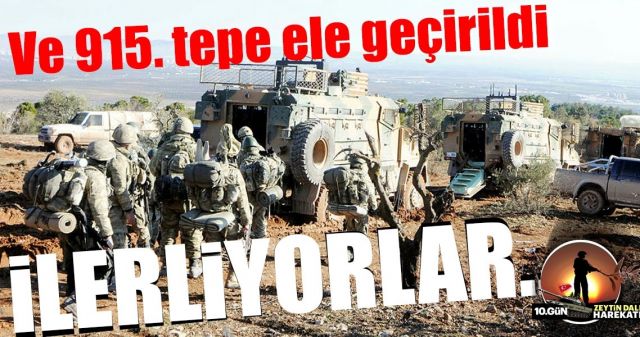 16.30: TSK ve ÖSO güçleri, Afrin'in batısındaki Racu beldesinde yer alan stratejik 915. Tepe'de kontrolü sağladı. Afrin'in batısındaki Racu belde merkezinin güneyindeki 915. Tepe'ye yönelik sabah saatlerinde başlayan operasyon sayesinde belde çevresinde terör örgütü PYD/PKK'ya karşı tüm hakim noktalar kontrol altına alındı. Öğle saatlerinde teröristlerden arındırılan 915. Tepe'nin alınması ile harekatın 10. gününde Afrin'in beş beldesinde 15'i köy, biri köy altı yerleşim ile 5'i stratejik dağ ve tepe olmak üzere 21 nokta örgütten kurtarılmış oldu. TSK ve harekata destek veren ÖSO güçleri, harekatın önceki günlerinde, Bülbül beldesinde Şengal, Zehran, Bali Köy, Kurni, Hay Oğlu, Heftar ve Ursa köyleri ile Kürdo köy altı yerleşimini, Racu beldesinde Edamanli, Ali Bekki, Bilal Köy, Ömer Uşağı ve Mamel Uşağı köyleri ve 740.Tepe'yi, Şeyh Hadid beldesinde Şeyh Hadid Tepesi ve Kara Mitlak köyü, Cinderes beldesinde Hammam köyü ile Mersides Tepesi'ni, Şeran beldesinde de Burseya Dağı ve Kastel Cündo köyü ele geçirmişti.