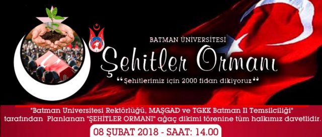 8 ŞUBAT PERŞEMBE GÜNÜ SAAT:14:00'te Batman Üniversitesi Rektörlüğü,"MAŞGAD"Manisa Şehit ve Gazi Aileleri Koruma ve Kalkındırma Derneği Batman il Temsilciliği ve TGKK il Temsilcilikleri Tarafından planlanan"ŞEHİTLER ORMANI"Ağaç Dikim Törenine Tüm Halk