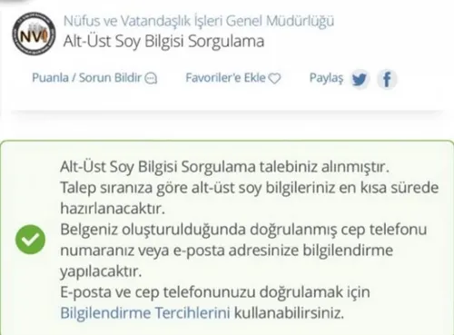 Vatandaşların belgeyi edinebilmek için talep oluşturmasının ardından ekrana otomatik olarak "Alt-üst soy bilgisi talebiniz alınmıştır. Talep sıranıza göre alt-üst soy bilgileriniz en kısa sürede hazırlanacaktır. Belgeniz oluşturulduğunda doğrulanmış cep telefonu numaranız veya e-posta adresine bilgilendirme yapılacaktır." mesajı geliyor.