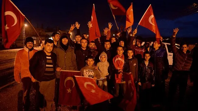 Köyün girişinde ellerinde Türk bayraklarıyla konvoyu karşılayan vatandaşlar, "Şehitler ölmez vatan bölünmez", "Ya Allah bismillah Allahuekber", "En büyük asker bizim asker" gibi sloganları atarak, askeri birliğe destek verdi.