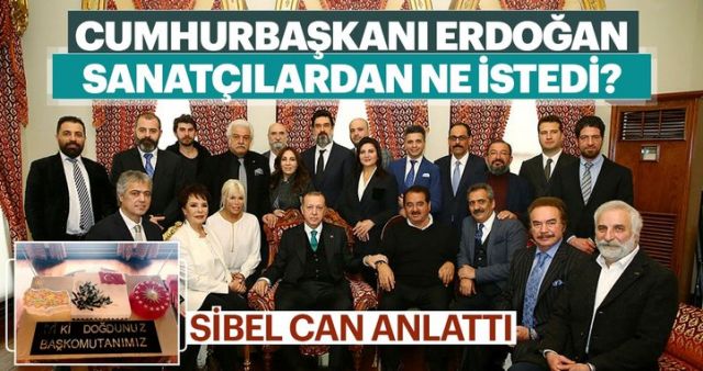 Sibel Can: "Uzun bir seyahat öncesi Cumhurbaşkanımız'a çok güzel bir moral vermek istedik. Gayet samimi ve çok sıcak bir ortam vardı. Sohbet o kadar güzeldi ki... Konu önce sigaradan açıldı. Sayın Erdoğan, Yavuz Bingöl ve Cengiz Kurtoğlu'na takıldı, onlara sigarayı bırakmalarını söyledi. Bunun için de Kültür Bakanı Numan Kurtulmuş'u görevlendirdi. 'Bakın, Sibel hayatı boyunca hiç sigara içmedi' diye de söyledi. Zeytin Dalı Operasyonu'nu da konuştuk. Kendisine, 'Halkımızla birlikte, tüm kalbimizle biz de operasyona destek veriyoruz' dedik."