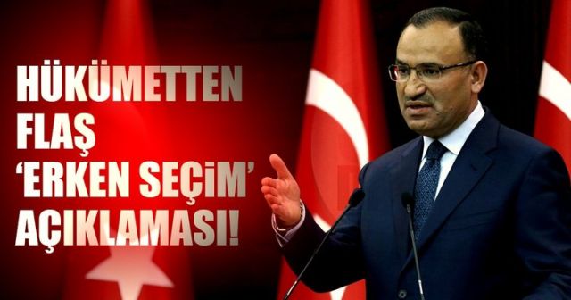 Başbakan Yardımcısı ve Hükümet Sözcüsü Bekir Bozdağ, erken seçim iddialarına yanıt verdi. Bozdağ, seçimlerin vaktinde yapılacağını söyledi. Bozdağ, "Daha önce bir kere erken seçim oldu, esasında çaresizlikten alınmış bir çare seçimidir. Türkiye'nin önünü açmak için yapılan bir seçimdi. AK Parti'nin döneminde seçimler zamanında yapılmıştır. Seçim zamanında yapılacaktır, buna alışmayanlar alışsınlar." dedi.
