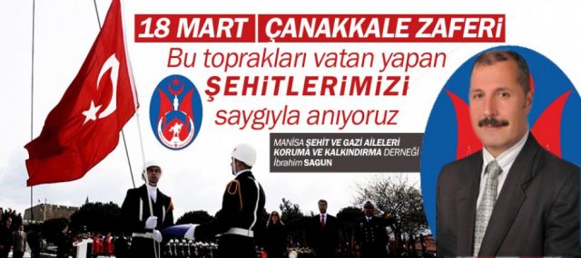 Manisa Şehit ve Gazi Aileleri Koruma ve Kalkındırma Derneği Yönetim Kurulu Başkanı İbrahim SAGUN 18 Mart Çanakkale Zaferi nedeniyle bir açıklama yaptı. SAGUN’ un açıklaması şöyle; "Bizi bağımsızlığa taşıyan adımların ilki bir özgürlük direnişi ve onurlu bir zaferin destanı olan Çanakkale Zaferi’nin, 103. Yılın da, kınalı elleriyle cepheye çıkan evlatlarımızın, yurdumuzu düşmana teslim etmeyen aziz kahramanlarımızın anısı önünde şükran ve saygı ile bir kez daha eğiliyoruz.
