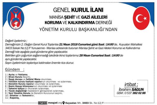 Manisa Şehit ve Gazi Aileleri Koruma ve Kalkındırma Derneği Başkanlığı'ndan 2. Olağan Genel Kurulu Toplantısı'na DAVET İlanı..