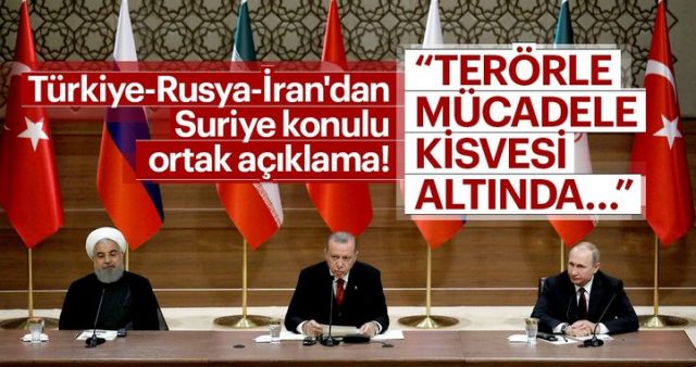Türkiye, Rusya ve İran liderlerinin zirvede imza attığı ortak açıklamada, terör örgütleri DEAŞ, Nusra Cephesi ve El Kaide veya DEAŞ'la bağlantılı tüm diğer bireyler, gruplar, teşebbüsler ve oluşumların ortadan kaldırılması için birlikte çalışmaya devam edileceğine dikkat çekildi.