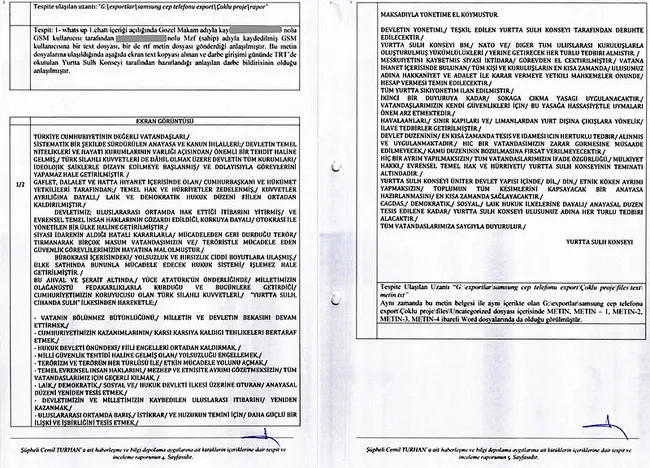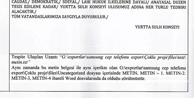 Söz konusu metnin defalarca değiştirildiği ve "Metin", "Metin-1", "Metin-2", "Metin-3" ve "Metin-4" şeklinde 5 ayrı dosya olarak kaydedildiği belirlendi.