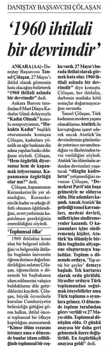 SABAH İNTERNETSözcü yazarı Emin Çölaşan'ın eşi Tansel Çölaşan'ın 2008 yılında yaptığı bir açıklamada Adnan Menderes, Fatin Rüştü Zorlu ve Hasan Polatkan'ın idamı hakkında şu ifadeleri kullandığı ortaya çıktı: "Bunlar idam edildiğinde toplumsal bir coşku vardı. 27 Mayıs'ı burada ihtilal olarak görmek hata olur. 1960 ihtilali aslında bir devrimdir"