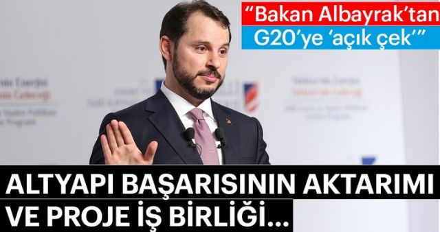 Türkiye'nin jeopolitik konumu, stratejik önemi ve yüksek kaliteli altyapısının yanı sıra, istikrarlı ve öngörülebilir ortamıyla yatırımlar için güvenilir bir liman olmayı sürdürdüğünü vurgulayan Bakan Albayrak, altyapı geliştirme faaliyetlerinin istihdam yaratma, eşitsizliklerleve terörizmle mücadele hedeflerine de katkıda bulunmasının önemine işaret etti. Bu nedenle, son 10 yılda dünya ekonomisinde yapılabilmiş 10 mega altyapı projesinin 6'sına ev sahipliği yapan Türkiye'nin, özel sermayenin katılımını artıran altyapı finansmanı konusundaki tecrübelerini daha fazla paylaşmaktan memnuniyet duyacağını ifade ederek, Bakan Albayrak G20 ülkelerine Türkiye'nin altyapı başarısının aktarımı ve proje işbirliği adına 'açık çek' verdi.