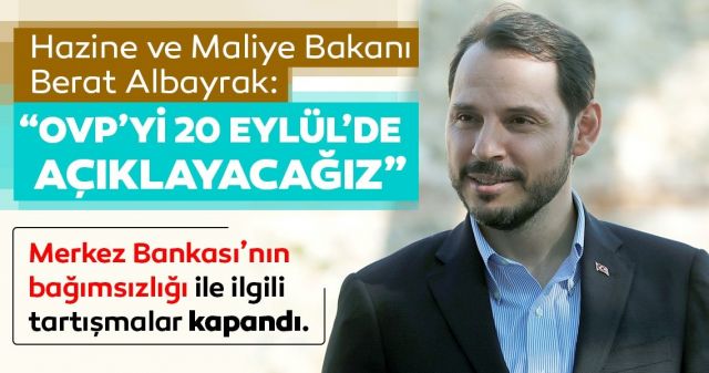 Hazine ve Maliye Bakanı Berat Albayrak, "Merkez Bankası enflasyonla mücadele konusunda para politikası alanında gerekli gördüğü adımı attı. Şimdi sıra mali taraftaki en önemli husus enflasyonla mücadele, sürdürülebilir ve sağlıklı büyüme, cari açığın düşürülmesi konularında 3 yıllık iş planımız olan Orta Vadeli Program'ın açıklanmasında. OVP'yi 20 Eylül'de açıklayacağız" dedi. Merkez Bankası'nın son kararının ardından "bağımsızlık" tartışmalarının kapandığını ve bundan sonra bu konudaki tartışmaların hiçbir gerçekliği ve karşılığı olmayacağını dile getiren Albayrak, ekimden itibaren enflasyonda da dengelenme ve aşağı yönlü trendin gözlemleneceğini dile getirdi. İşte Albayrak'ın mesajları...