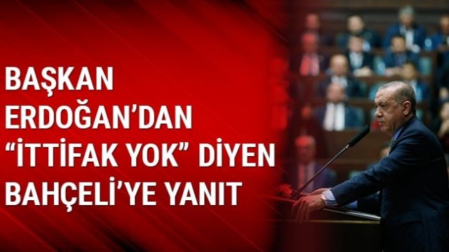 Başkan Erdoğan, AK Parti Grup Toplantısı'nda konuştu. Başkan Erdoğan, Bahçeli'nin 'Yerelde ittifak yok' açıklamalarıyla ilgili 'Görüş farklılıklarımızın Cumhur İttifakı'na gölge düşürmesine fırsat vermemeliyiz. MHP 'yerel seçimlerde biz kendi yolumuza' diyorsa biz de 'Herkes kendi yoluna' deriz' dedi.