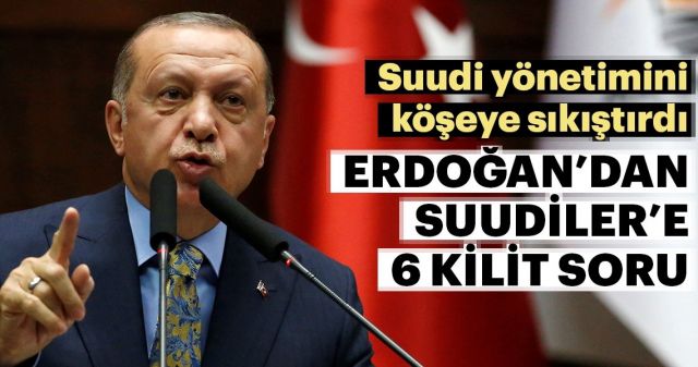 1-Olayla ilişkili vasıflara sahip 15 kişi cinayet günü niçin İstanbul'da toplanmıştır?2-Kimden emir alarak oraya gelmişlerdir?3-Başkonsolosluk binası niçin hemen değil de günler sonra incelemeye açılmıştır?4-Cinayet açıkça ortadayken onca tutarsız açıklama niçin yapılmıştır?5-Öldürüldüğü resmen kabul edilen bir kişinin cesedi niçin hâlâ ortada yok?6-Cesedin yerli işbirlikçiye verildiği ifadesi doğruysa bu yerli işbirlikçiyi açıklamaya mecbursun.Başkan Recep Tayyip Erdoğan, günler öncesinden Cemal Kaşıkçı cinayetiyle ilgili açıklama yapacağını söylediği ve dünyanın merakla beklediği AK Parti grup toplantısında önemli mesajlar verdi. İşte Erdoğan'ın konuşmasının satır başları;