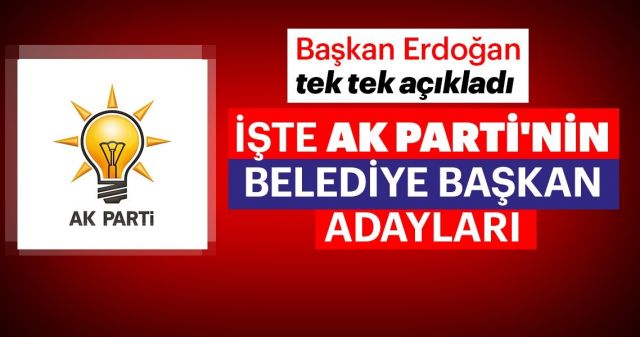AK Parti Grup Toplantısı'nda Cumhurbaşkanı Erdoğan bugün 20 ilin Belediye Başkan adaylarını daha açıkladı. İstanbul Büyükşehir Belediye Başkan Adayı'nı Güney Amerika dönüşü açıklayacağını belirten Cumhurbaşkanı Erdoğan, İzmir ve Ankara adaylarını açıkladı. İşte daha önce açıklanan 40 adayla birlikte toplam 60 ilin AK Parti Belediye Başkan adayları...