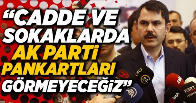 Çevre ve Şehircilik Bakanı Murat Kurum, AK Parti'nin seçim süreci boyunca afiş ve pankartla çevre kirliliğine yol açmayacağını belirterek, "Cadde ve sokaklarda AK Parti'nin broşür ve pankartlarını görmeyeceğiz. Belli saatler dışında da AK Parti otobüslerimiz propaganda yapmayacak. Dolayısıyla hem çevreye hem de gürültüye karşı çok büyük bir eylem başlatmış olacağız" diye belirtti.