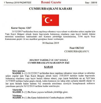 Resmi Gazete'de yayımlanan kararla İmar Barışı yapı kayıt bedeli ödeme süresi 31 Aralık 2019 tarihine kadar uzatıldı.