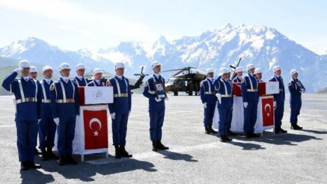 Saygı duruşu, şehitlerin özgeçmişi ve dua okunmasının ardından şehitlerin naaşları, silah arkadaşları tarafından omuzlarda taşınarak helikoptere konuldu.