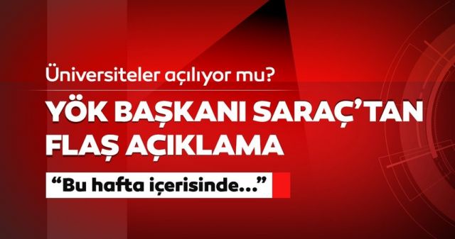 Akademik düzeyde eğitim kurumlarının açılması ve koronavirüs tedbirleri kapsamında oluşturulacak formülle yüz yüze eğitimin geçilmesine ilişkin YÖK Başkanı Saraç'tan son dakika açıklaması: "Sağlık Bakanlığımız konuyla ilgili üniversitelerin açılmasına yönelik görüşünü bu hafta içinde netleştirecek. Beklentimiz bu yönde"