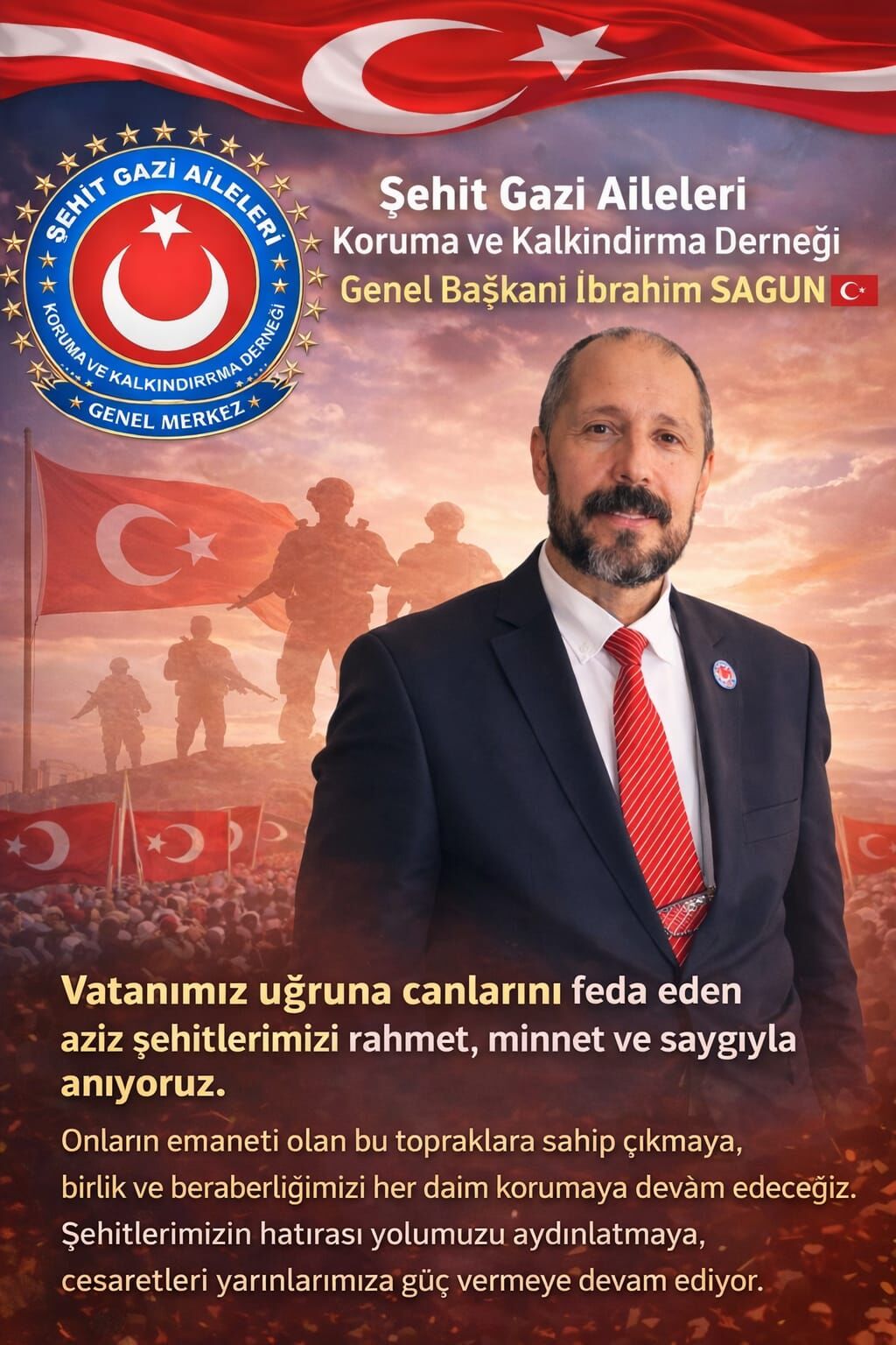 Şehit Gazi Aileleri Koruma ve Kalkındırma Derneği Genel Başkanı İbrahim Sagun, Şehitler Haftası dolayısıyla bir mesaj yayımladı. Sagun, vatan uğruna hayatını kaybeden şehitleri rahmet, minnet ve saygıyla andıklarını ifade etti.