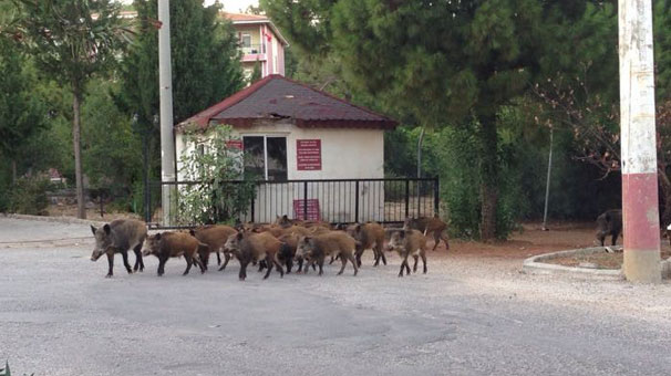Muğla'nın Marmaris ilçesinde aç kalan çok sayıda yaban domuzu kent merkezine indi. Bu sırada evine dönen bir polis memuru domuzların saldırısından son anda kurtuldu.