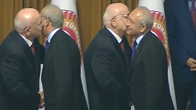 Resepsiyon salonuna girişte Kılıçdaroğlu ve Kahraman arasında samimi br sohbet ve ilginç görüntüler orataya çıktı. Kılıçdaroğlu ile derin bir sohbete başlayan Kahraman sohbet sırasında Kılıçdaroğlu'nu yakalarından öptü. Bir süre daha Kılıçdaroğlu ile sohbet eden Kahraman, daha sonra CHP liderini serbest bıraktı.