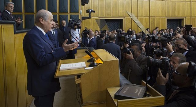 MHP Genel Başkanı Bahçeli, partisinin TBMM’deki grup toplantısında yaptığı konuşmada, "Biz devletin tıkandığını, sistemini kilitlendiğini, anayasanın askıya alındığını söylüyoruz. Mevcut filli durumla hukukun uyuşmadığını, devletin ve milletin geleceğinde tedavisi belki de imkansız yaralar açacağını ısrarla ifade ediyoruz. Özellikle 15 Temmuz’dan sonra dönüşüm gösteren siyasi ve sosyal dinamiklerin yeni bir durum ve ihtiyaçları ortaya çıkardığını görüyoruz. Sayın Cumhurbaşkanı’nı millet seçti, bu tartışmasızdır. Ancak Sayın Erdoğan’ın seçen millet anayasaya rafa kaldırarak fiilen başkan olsun demedi. Türkiye’nin ağırlaşan iç ve dış şartları öncelikle ve mutlaka hukukun temel ve vazgeçilmez ilkelerine bağlılığı gerektirmektedir. Kim ne söylerse söylesin, fiilen devlet idaresi hukukun üstünlüğüyle çelişmektedir. Biz fermanla ülke yönetilmesini geride bıraktık. Aksi mümkün olmadıkça, her devlet ve siyaset adamının görev, yetki ve sorumluluk alanlarının kapsam ve sınırı hukukla belirlenmiş, buna göre tayin edilmiştir. Cumhurbaşkanlığı makamının tarafsızlığını, toplumun her kesimine eşit uzaklığını ihlal etmesi devlette anarşi ve kaosu tetikleyecektir. Türkiye’nin kurşun gibi ağır bir ortamdan geçtiği şu zaman sürecinde, muhataplarımızı hukuka uymaya, anayasaya bağlı kalmaya çağırmamız kadar meşru bir şey de olmayacaktır. Bu itibarla fiili başkanlık uygulaması Türkiye Cumhuriyeti’nin yönetim ve idare sistemine, Cumhuriyet’in miras ve mesajlarına tamamen aykırıdır. Sırf millet seçti bahanesiyle fiili başkanlığa kılıf aranması, mazeret uydurulması boş ve beyhude bir çabadır" diye konuştu.