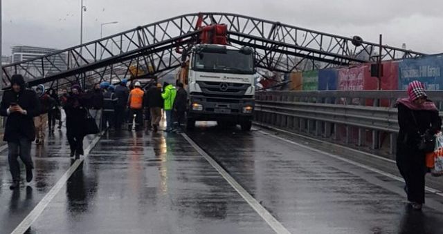 İstanbul'da E-5'te vinç devrildi... Kaza sonrası trafik durdu.