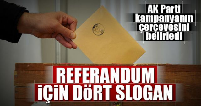 Cumhurbaşkanlığı sistemi ile ilgili anayasa değişikliği Cumhurbaşkanı Tayyip Erdoğan'ın onayını beklerken, AK Parti kampanya hazırlıklarına hız verdi. Referandumun taşıyıcı sloganında "demokrasi, refah, birlik, güçlü Türkiye" olmak üzere dört başlığa vurgu yapılacak. AK Parti Tanıtım ve Medyadan Sorumlu Genel Başkan Yardımcısı Cevdet Yılmaz, anayasa değişikliği referandumuyla ilgili kampanyay ı15 Temmuz'da şehit olan reklamcı Erol Olçok şirketiyle yaptıklarını belirterek, "Slogan, afişler konusunda mutfak çalışması başladı. Sloganların yer aldığı broşürler basılacak. Sivil toplum kuruluşlarının kampanyanın parçası olması önem taşıyor. Bu seçim değil milli bir mesele. O yüzden seçmen tercihleri değişiyor. Parti dışı kesimleri de içermeli" diye konuştu. AK Parti il teşkilatlarının da "Kararımız evet" kitapçıklarından bastıracağını anlatan Yılmaz, "Bu kitapçıkta slogan kullanmadık. İnsanların zihninde kalmasın istiyoruz. Sloganlarımızın yer aldığı broşürler için çalışılıyor. Taşıyıcı bir sloganımız olacak, sonra da nihai bir sloganımız olacak. Toplumun beklentileri, tartışmaları değerlendirerek bir seçim yapacağız. Toplumdaki duyguları yakalamamız önem taşıyor. Bu analiz gerektiriyor. O yüzden derin bir çalışma yapılıyor" dedi.