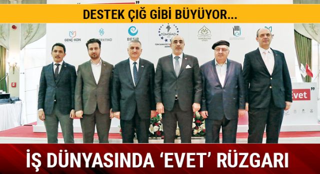 Türkiye’yi daha güçlü bir ekonomiye ve daha istikrarlı bir yapıya kavuşturacak ‘Cumhurbaşkanlığı sistemi’ni getiren Anayasa değişikliğine iş dünyasının ‘evet’ kararı çığ gibi büyüyor. 16 Nisan’da gerçekleştirilecek Anayasa referandumuyla ilgili iş dünyasında adeta ‘evet’ rüzgarı esiyor. İstanbul Ticaret Odası (İTO) öncülüğünde yapılan ‘Cumhurbaşkanlığı sistemine evet’ açıklamasına 21 STK’nın imza atması, yine Müstakil Sanayici ve İşadamları Derneği’nin (MÜSİAD) güçlü Türkiye için ‘evet’ dediğini açıklamasının ardından dün de 12 bin üyesi bulunan Tüm Sanayici ve İşadamları Derneği (TÜMSİAD) ile 5 sivil toplum örgütü Anayasa değişikliğine ‘evet’ diyeceğini açıkladı.