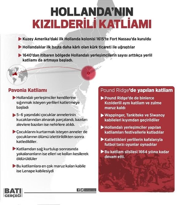 Kuzey Amerika'daki ilk Hollanda kolonisi 1615'te Fort Nassau'da kuruldu. Hollandalılar ilk başta daha karlı olan kürk ticareti ile uğraştı. 1640'dan itibaren bölgede Hollandalı yerleşimcilerin sayısı arttıkça yerli katliamı da artmaya başladı. Hollandalı yerleşimciler kendilerine sığınmak isteyen yerleşimcileri katletti. 5-6 yaşındaki çocuklar anneleçrinin kucaklarından alınarak parçalandı. Bazıları alevlere bazıları ise nehirlere atıldı