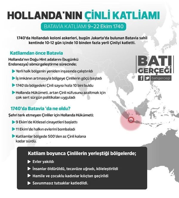 1740'da Hollandalı koloni askerleri, bugün Jakarta'da bulunan Batavia sahil kentinde 10-12 gün içinde 10 binden fazla yerli Çinliyi katletti.